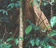 Trees in the rainforest have shallow roots. They are supported by wide butressing at the base. Note the termite trail running up the center of the trunk.