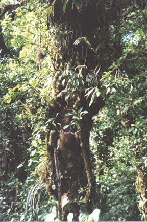 Trees in the rainforest have shallow roots. They are supported by wide butressing at the base. Note the termite trail running up the center of the trunk.